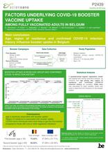 To tackle waning protection against severe COVID-19 infection, booster doses of the COVID-19 vaccines were recommended among individuals who received their primary course. A first COVID-19 vaccine booster campaign was performed in winter of 2021 (age ≥ 18 years) and a second campaign for (age ≥ 50 years) in autumn of 2022. During these campaigns persons were actively invited to get a booster dose against COVID-19. We aimed to explore (first and second) booster uptake among fully vaccinated adults in Belgium and investigate demographic (age, region of residence and sex) and COVID-19 related (having had a documented COVID-19 infection) factors associated with the first and second booster uptake.