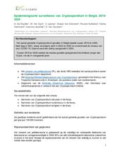 - Het aantal gemelde Cryptosporidium-gevallen in België daalde tussen 2019 en 2020, bleef laag in 2021, steeg vervolgens sterk in 2022 en 2023 en overschreed de niveaus van voor COVID-19. Daarna werd een daling vastgesteld in 2024.