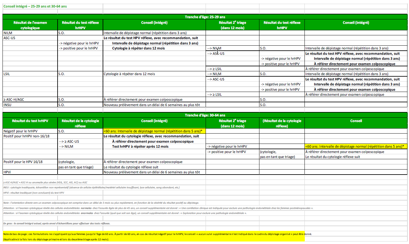 R : Dans le tableau du conseil intégré, une limite d’âge est ajoutée à ce résultat : <60 ans. En outre, une note de bas de page indique qu’à partir de 60 ans, le conseil « aucun suivi supplémentaire n’est indiqué dans le cadre du dépistage organisé » peut être donné en cas de résultat hrHPV négatif.