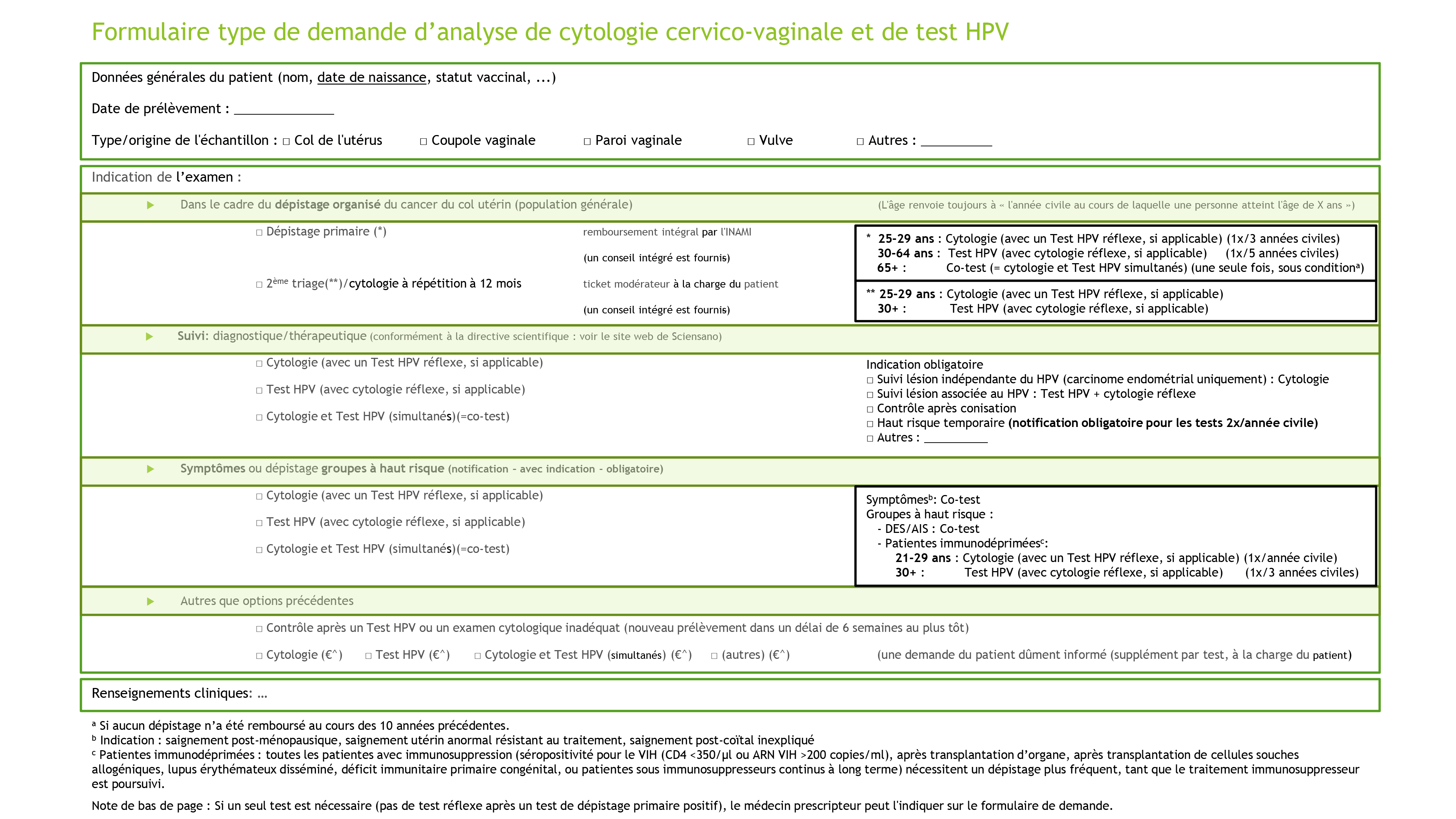 - Q : Existe-t-il un modèle de formulaire de demande pour la cytologie cervicovaginale et le test HPV dans le cadre du nouveau programme de dépistage du cancer du col de l’utérus ?