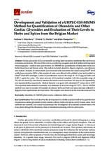 Cardiac glycosides (CGs) are naturally occurring plant secondary metabolites that can be toxic to humans and animals. The aim of this work was to develop a targeted analytical method utilizing liquid chromatography—tandem mass spectrometry (LC-MS/MS) for quantification of these plant toxins in a herbal-based food and human urine. The method included oleandrin, digoxin, digitoxin, convallatoxin, and ouabain. Samples of culinary herbs were extracted with acetonitrile and cleaned using Oasis® MAX solid-phase extraction (SPE), while samples of urine were diluted with acidified water and pu…
