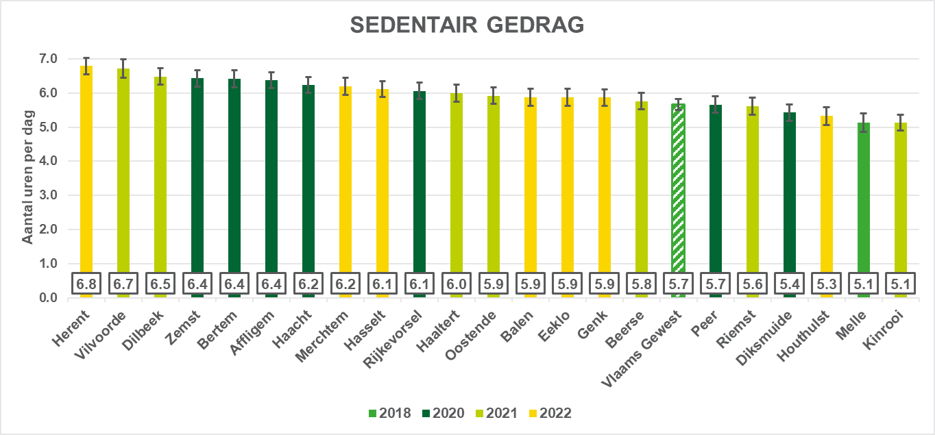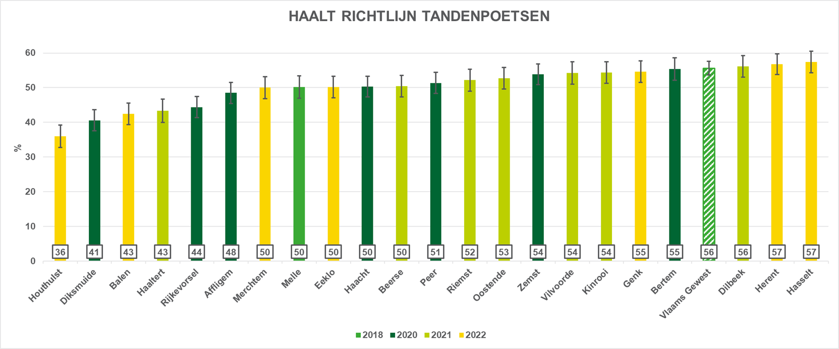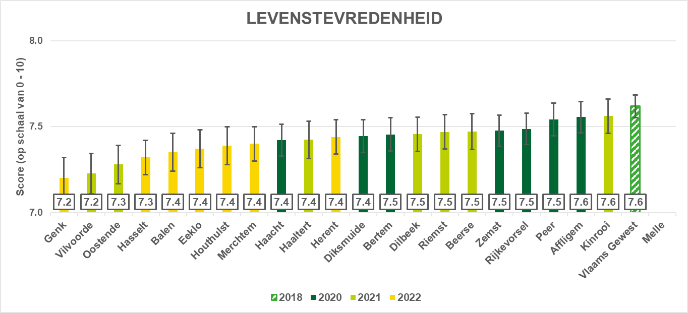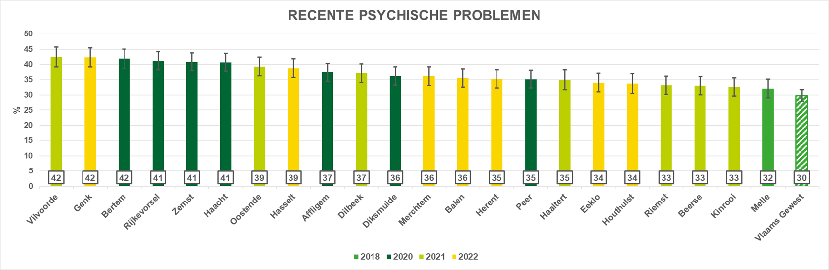 De figuren geven percentages of gemiddeldes met hun 95%-betrouwbaarheidsinterval weer. Dat laatste moet je zien als een mogelijke foutmarge op het gegeven percentage of gemiddelde. Wanneer er voor een bepaalde meting geen overlap is tussen de betrouwbaarheidsintervallen van 2 gemeenten, kan je stellen dat er een duidelijk („significant”) verschil is tussen beide. De figuren tonen ook de resultaten voor het Vlaams Gewest uit de nationale gezondheidsenquête 2018 (gearceerde balk). Dat laat toe om de verschillen tussen de gemeenten en/of het gewest te zien, en ook te kijken wat de aandachtspunten voor een bepaalde gemeente zijn. Dit kan als leidraad dienen voor het lokale gezondheidsbeleid. Voor ondersteuning hierbij kunnen de lokale besturen terecht bij het Logo. Zij geven begeleiding en reiken methoden aan om de gezondheidsstatus van de inwoners te verbeteren.