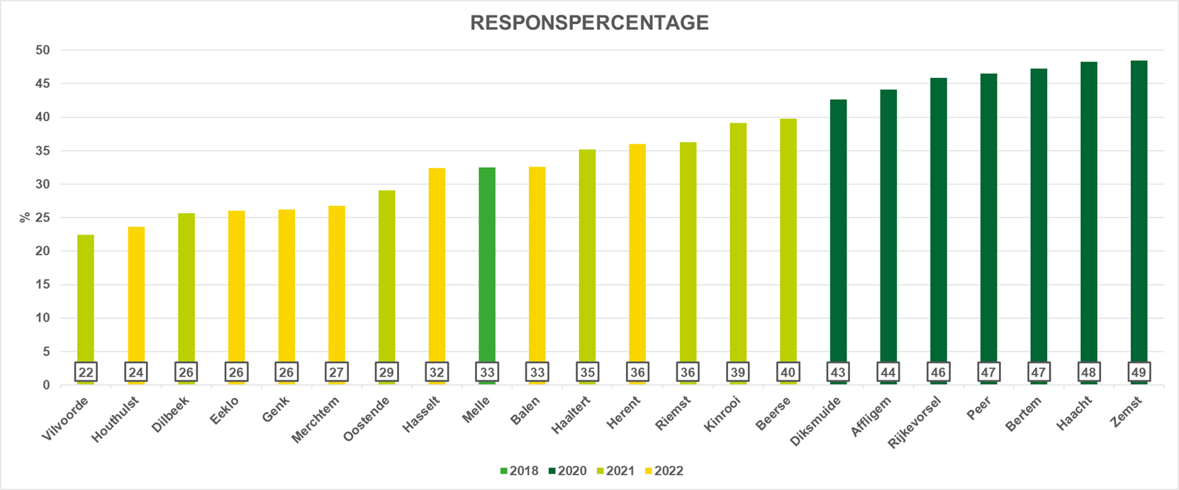 In onderstaande figuur staat een overzicht van het responspercentage per gemeente. Dit werd berekend op basis van het aantal personen dat een geldige vragenlijst invulde ten opzichte van het totaal aantal verzonden uitnodigingsbrieven.