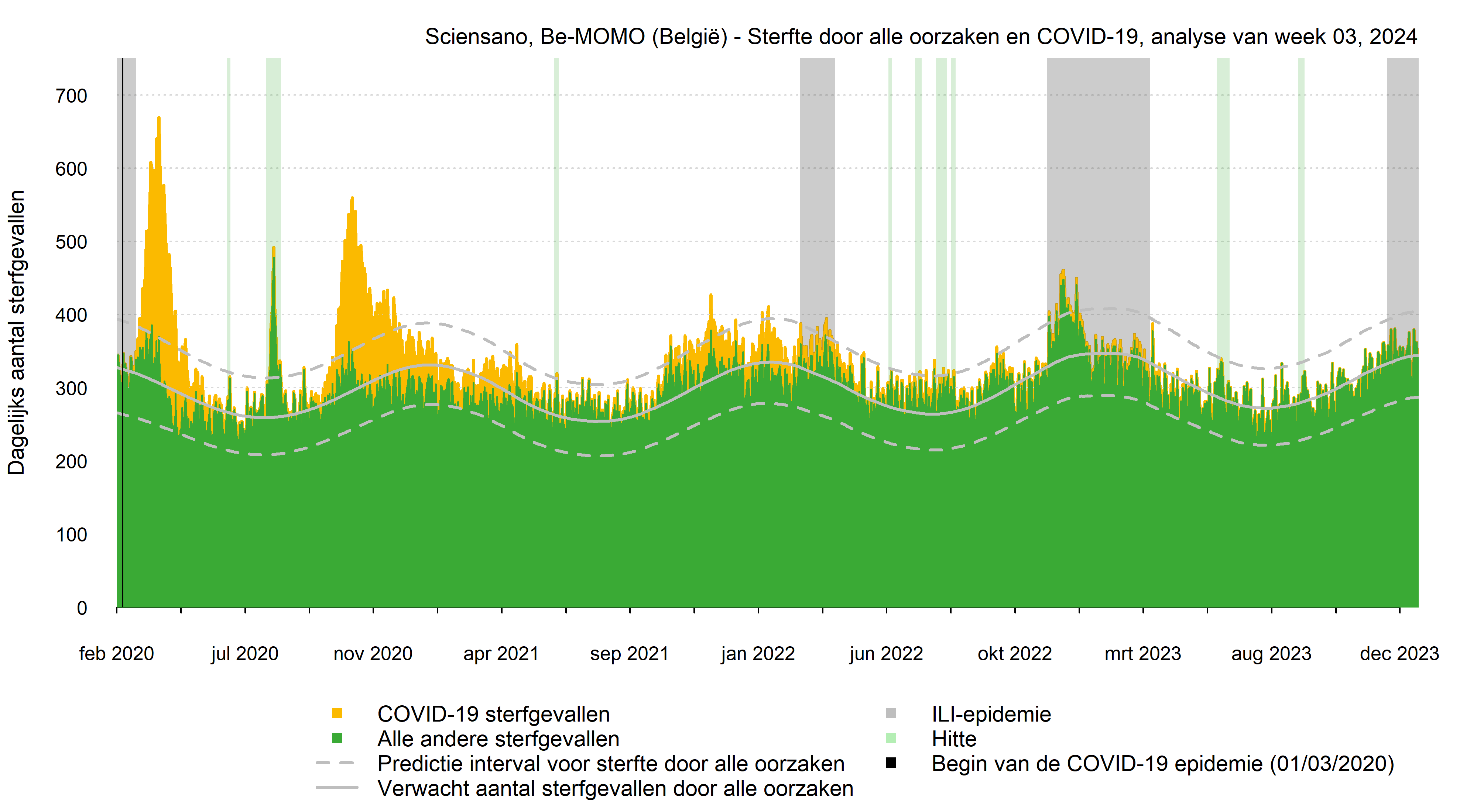Figuur 1. Overlijdens door alle oorzaken, COVID-19 en andere doodsoorzaken, januari 2020 tot januari 2024, België