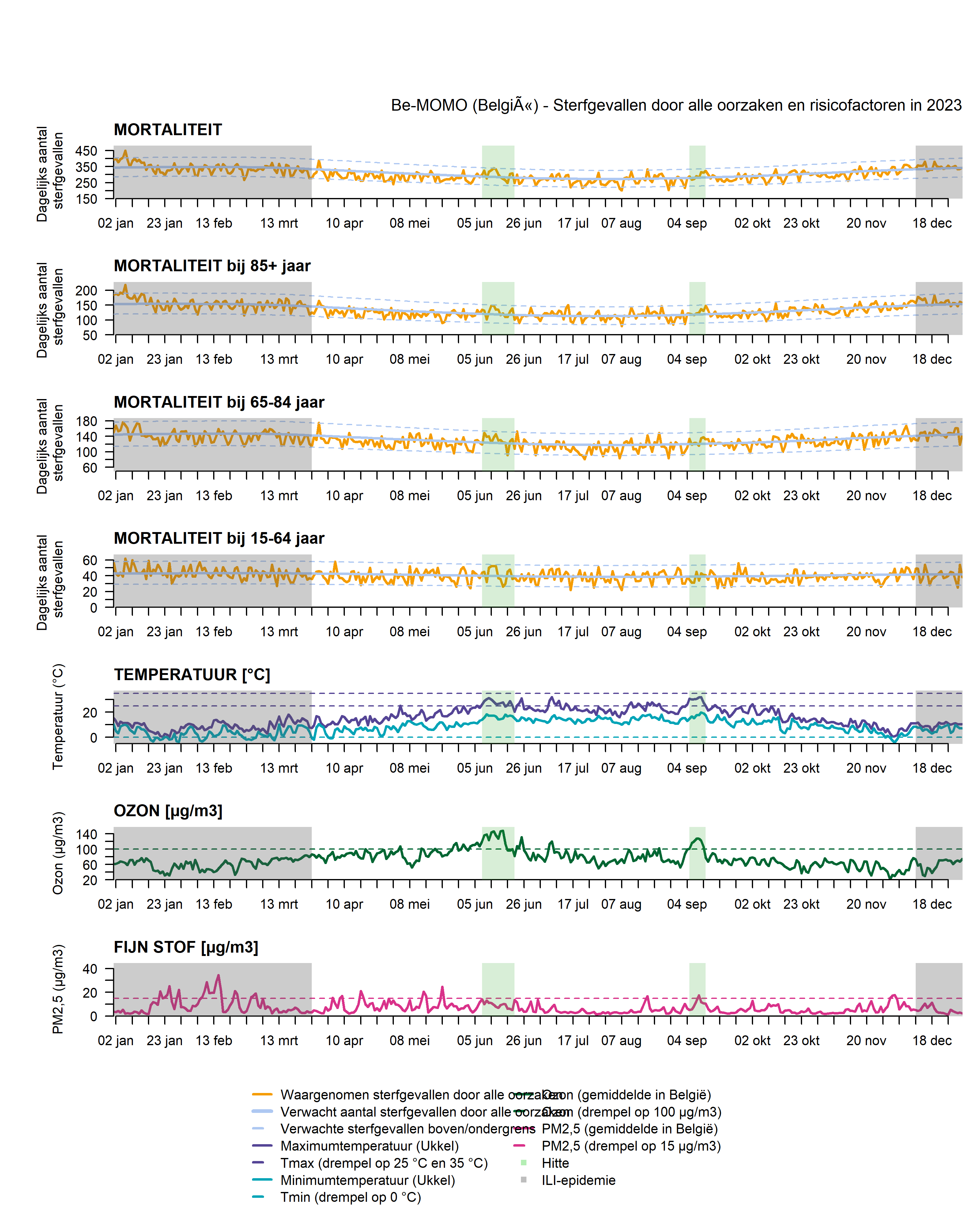 Met 2.772 minder sterfgevallen dan voorspeld (-2,5%) door het Be-MOMO-model (The Belgian Mortality Monitoring) van Sciensano, werd 2023 niet gekenmerkt door oversterfte, maar door ondersterfte. In tegenstelling tot de voorgaande jaren waren factoren die het risico op overlijden vergroten (extreme temperaturen, luchtvervuiling, infectieziekten) in 2023 veel minder aanwezig. Bovendien heeft een oogsteffect, d.w.z. de vroegtijdige sterfte van kwetsbare mensen tijdens de jaren van de COVID-19-epidemie, ongetwijfeld bijgedragen aan de ondersterfte in 2023.