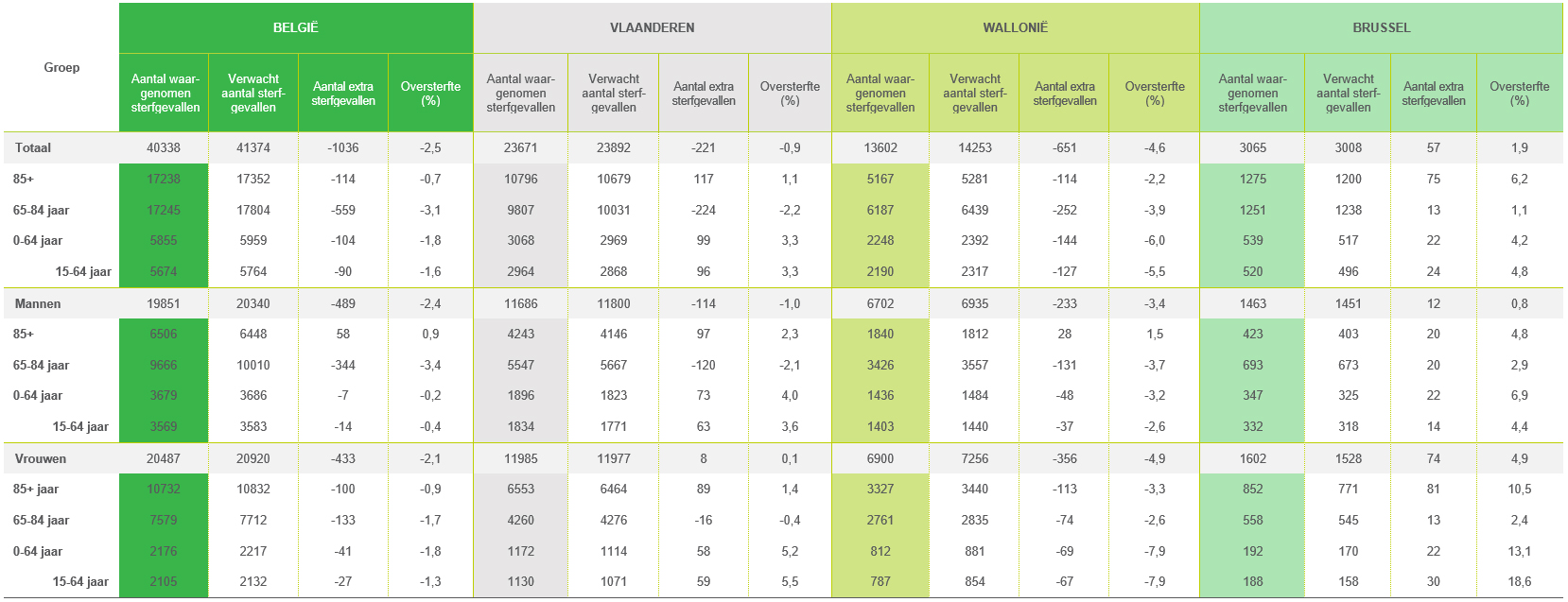 Over de volledige bevolking bekeken, was er ondersterfte in Vlaanderen en Wallonië, maar niet in Brussel (tabel 1).